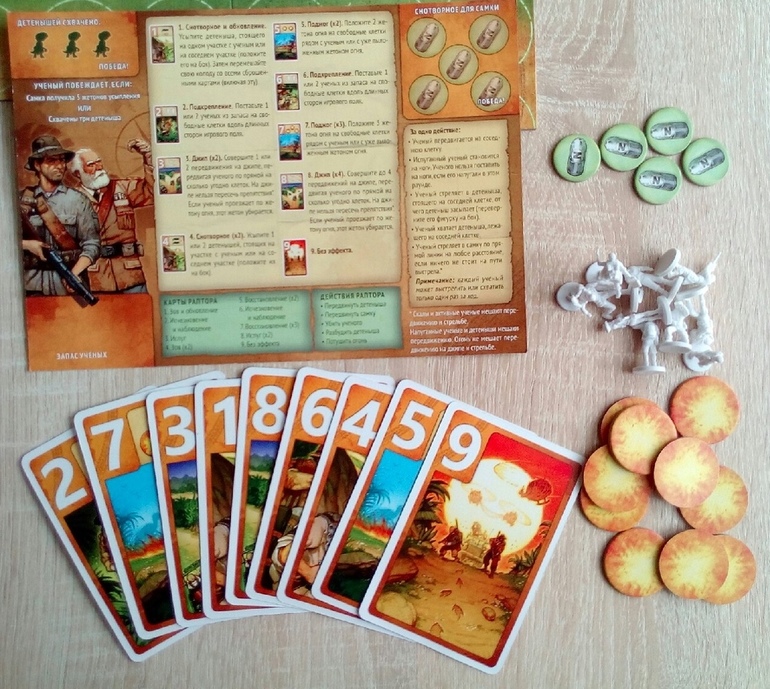 Суть игры: Раптор побеждает, если 1) три детеныша спаслись с игрового поля или 2) на поле не осталось ни одного ученого. Ученый побеждает, если: 1) самка получила 5 жетонов усыпления или 2) три детеныша усыплены и захвачены.