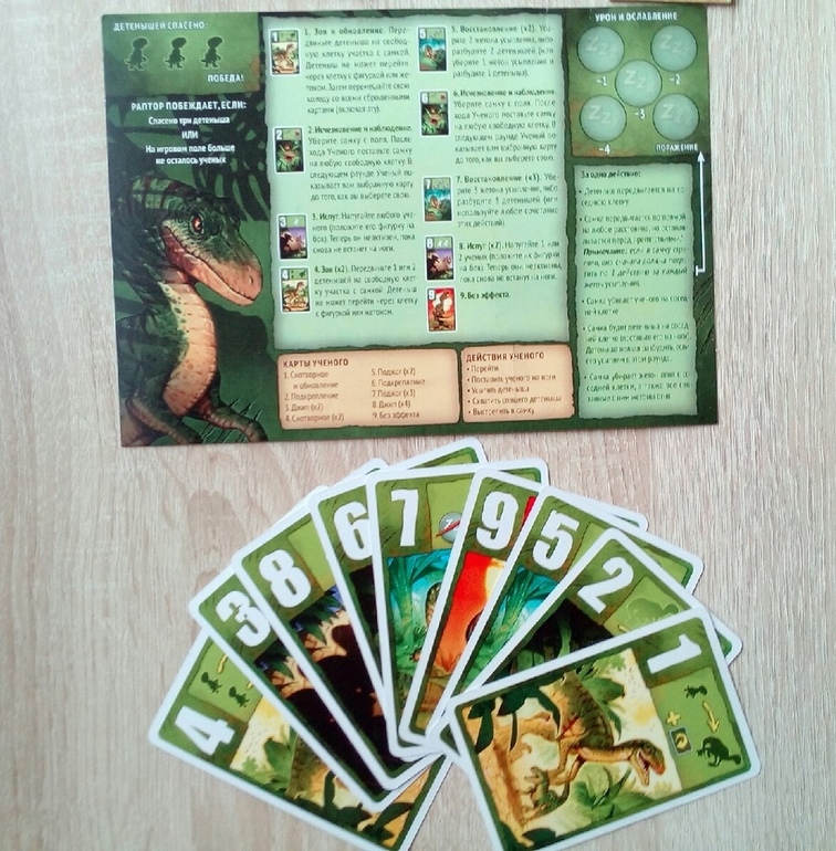 Но чаще у карт будет разное значение. В этом случае, игрок, чье значение карты меньше, ходит первым и выполняет эффект своей карты. Эффекты карт указаны на планшете каждого игрока, у ученых и раптора эффекты разные.