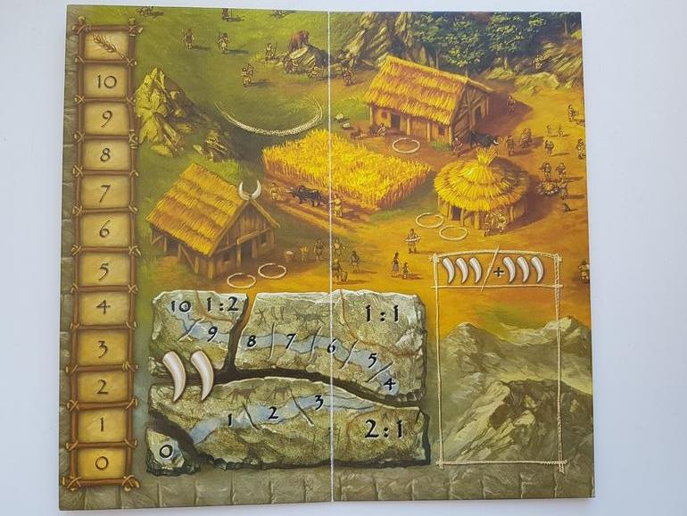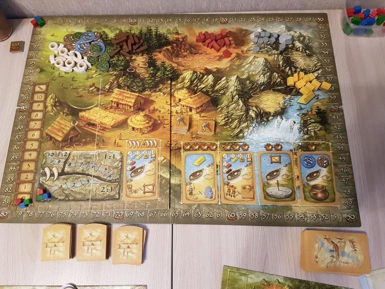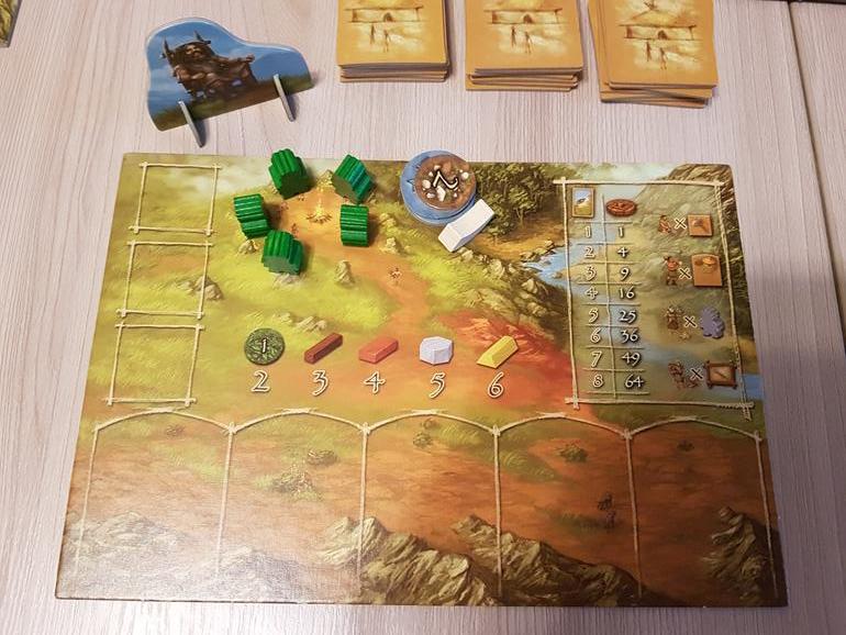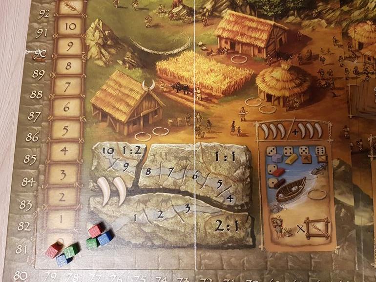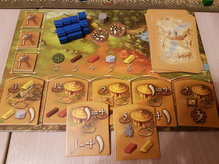 Но обо всем по порядку. Перед началом игры на поле добавляем новую локацию - торговую хижину (пункт обмена) и трек торговли (кладется просто поверх поля, немного скользит, желательно в игре не задевать, человечков и карты класть аккуратно). Карт развития, доступных для приобретения, стало 5, но одна берется исключительно за бивни. Зато теперь не стало места на поле для хижин, поэтому они кладутся просто внизу под полем.