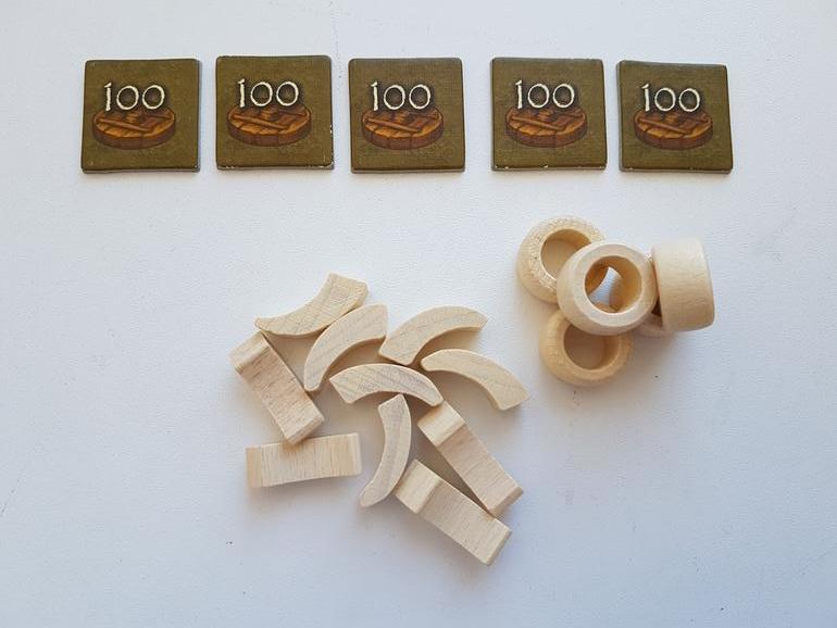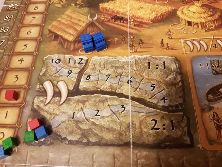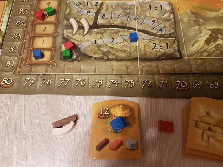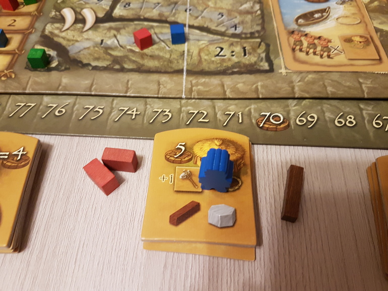 К примеру, я строю хижину, но у меня совсем нет кирпича, не успела добыть, в карьере уже не было места. Но так как я уже немного умею торговать (мой маркер на треке торговли стоит на тройке), я обмениваю по курсу 2 к 1 бивень и дерево на 1 кирпич. Все, хижина построена.