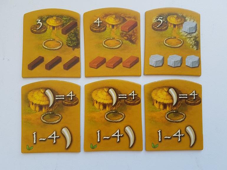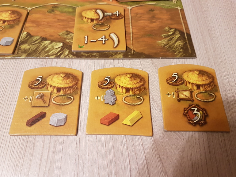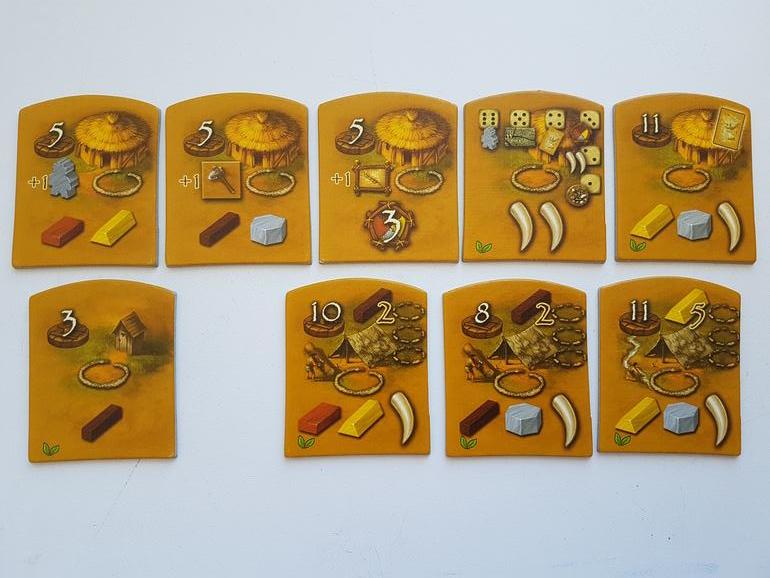 Хижины очень интересные, отличаются от "базовых" тем, что каждая построенная хижина может приносить какую-то пользу, то есть принести одноразовый бонус или работать на планшете игрока. Бонусы - новый член племени, топорик, продвижение по шкале пашни и т.д. А "работающие" хижины приносят своему владельцу 1 ресурс каждый ход или позволяют получать дерево и золото чуть дешевле. В общем, свойства очень интересные, которые игру хорошо разнообразят.