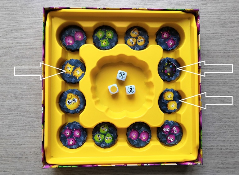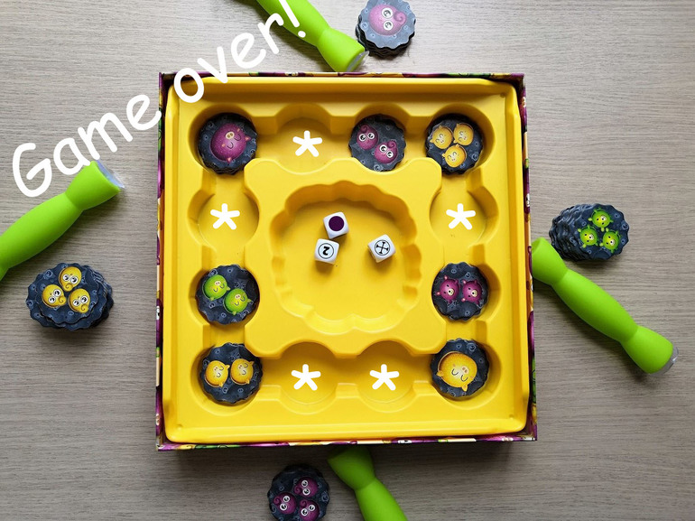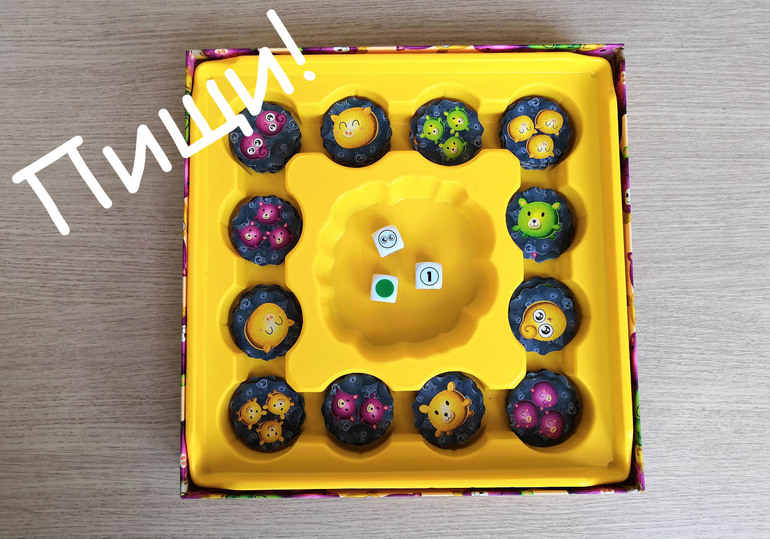 Если после броска кубиков, на поле нет соответствующей фишки, то ПИЩИМ пищалкой! И желательно быстрее остальных. Кто последний выдавил звук из своей зеленой присоски, тот возвращает из своих запасов одну фишку на поле.