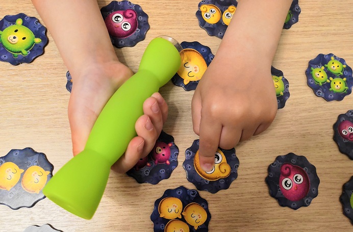 С малышами рекомендуется начинать играть с 1-2 признаками. Мы послушались издателя и сначала сыграли с цветным кубиком. Оказалось легко и, конечно, очень азартно. Ввели в игру второй кубик - числовой. Время поиска нужных жетонов у моего четырехлетки заметно увеличилось. С тремя кубиками игра перестала быть на скорость.