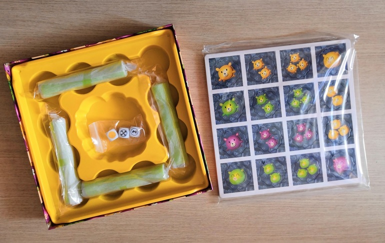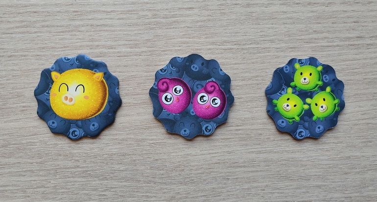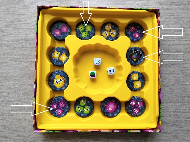 В игре участвуют 54 фишки с мишутками, птенчиками и хрюшками и 10 бонусных фишек.