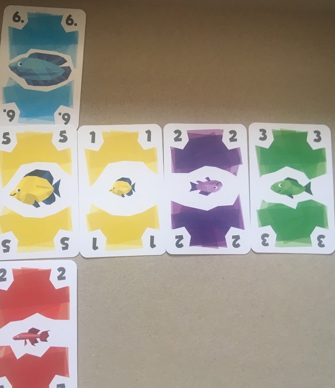 Я выбрала второй ряд и выложила жёлтую рыбу с цифрой 1, потому что она совпадает по цвету с предыдущей. Затем выложила фиолетовую рыбу , так как на этот цвет не заканчивается ни один из рядов. Затем я выложила зеленую карту по тому же правилу.
