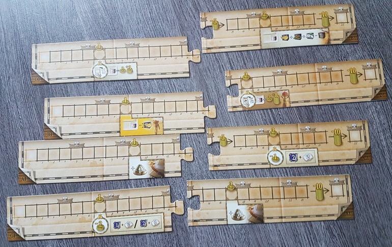 С четырёх сторон поле окружают треки, которые закреплены за конкретной компанией. Треки раскладываются случайным образом, отвечают за число акций, находящихся во владении игрока, и дают дополнительные бонусы, которые получаешь, пересекая определённые отметки.