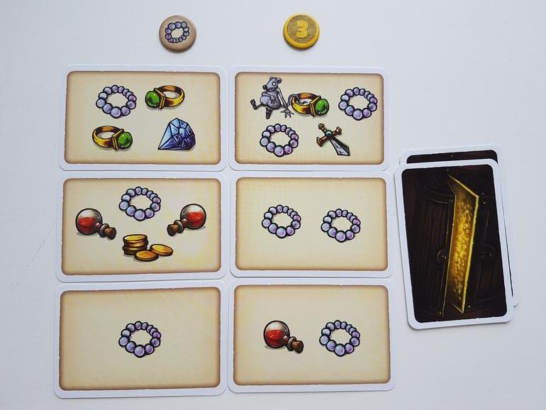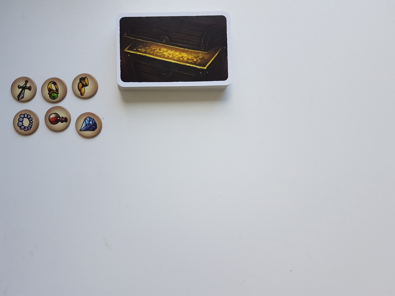 Игрок в свой ход вместо того, чтобы открыть очередную карту из колоды, берет один из жетонов сокровищ и кладет его на одну из четырех стопок карт. По его мнению, в этой стопке много бус (просматривать стопки нельзя, можно только надеяться на свою память), поэтому он взял именно жетон бус. Он забирает себе эту стопку и в текущем раунде больше не участвует.