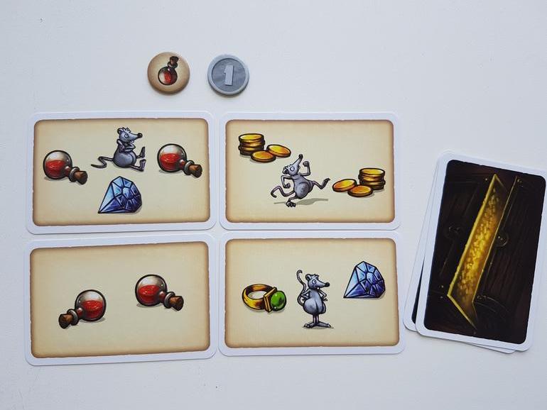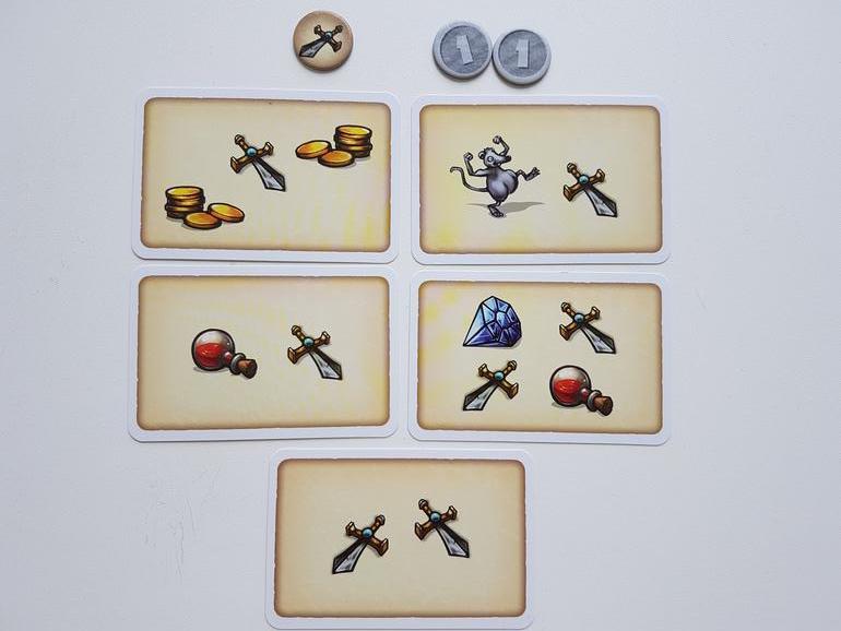 Следующий игрок забрал мечи. У него их 7, и мышонок принёс восьмой. По правилам игрок, который отстает от лидера всего на одно сокровище, получает две серебряные монеты (2 ПО).
