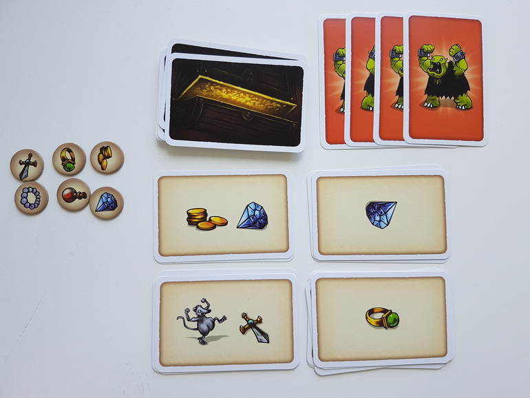 Впечатления. В своей нише - быстрых, компактных и недорогих карточных филлеров - игра очень даже хороша. Я брала и буду брать ее в гости наряду с Предельным погружением. Кстати, у этих игр много общего - риск, но вместе с тем необходимость умерить свою жадность, тесное взаимодействие с другими игроками, доля везения, несколько раундов. Но игры не дубли, ощущения от них все же немного разные - для того, чтобы украсть сокровища орка, нужно запоминать карты и даже можно попытаться запутать других игроков, не слишком явно накапливая в одной из стопок определенные сокровища. Так что обе коробки хорошо уживаются в одной коллекции. Оптимальное количество игроков, на мой взгляд, 3-4. Хотя можно и вдвоем сыграть, в таком случае будет немного меньше конкуренции и возможность накопить больше сокровищ.