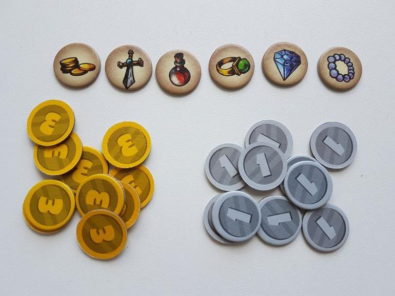 Жетоны золотых и серебрянных монет - это победные очки, понадобятся в конце раунда.