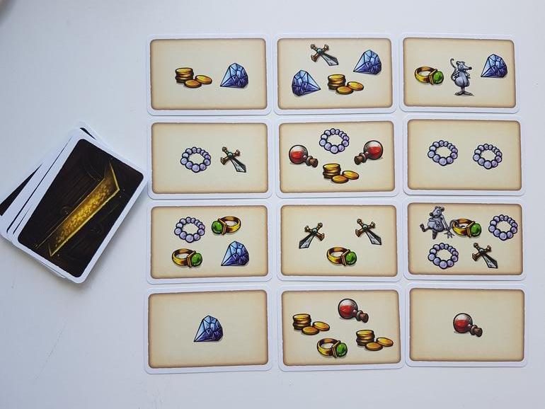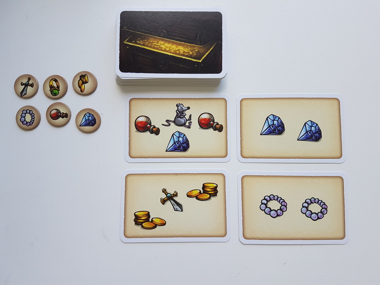 Игроки по очереди открывают по одной карте сокровищ из колоды и выкладывают их в 4 стопки (в любую по своему желанию), стараясь запомнить хотя бы приблизительно, какие драгоценности накапливаются в каждой из стопок.
