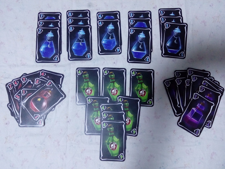 В наборе 50 карт, 8 карт яда и по 14 карт зелий трёх цветов.