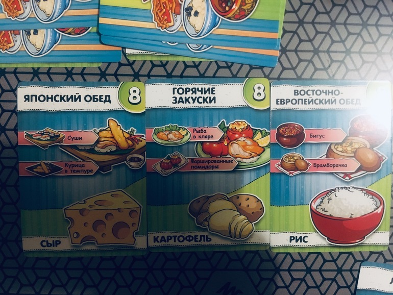 Карта может быть сыграна двумя вариантами, как продукт- ингредиент нарисован внизу карты; и как блюдо- название вверху карты.