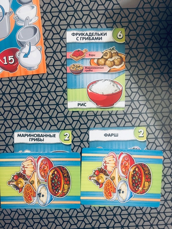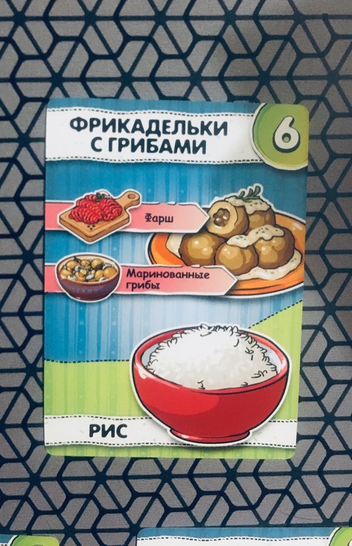 Чтобы его приготовить , мне понадобятся не продукты из холодильника, а готовые блюда и полуфабрикаты, выложенные перед игроками. В предыдущие ходы я готовила маринованные грибы, а мой оппонент - фарш. Я выкладываю карту фрикаделек с грибами перед собой и кладу сверху карту фарш и карту маринованным грибов.
