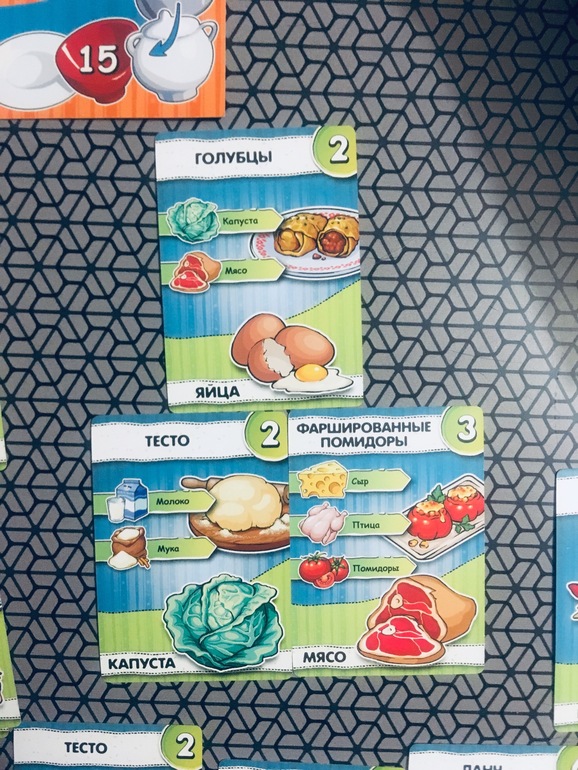 Например, у меня в руке есть карта с блюдом голубцы . А в холодильнике ( в центре стола) есть необходимые продукты( капуста и мясо)