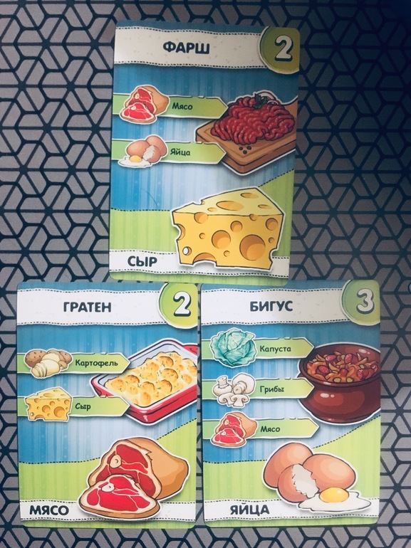 Многокомпонентное блюдо готово. Я получаю 6 очков. Мой коллега, фарш которого я бесцеремонно использовала, получает половину от моих победных очков за этот ход, т.е. 3. Если бы я использовала только те блюда, которые лежат передо мной, то победными баллами делиться бы не пришлось.