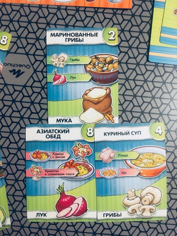 Снова мой ход . Я смотрю на свои карты и вижу , что продукты в центре стола позволяют приготовить маринованные грибы, карта которых у меня в руке. Проделываю всё те же манипуляции, зарабатываю два очка и двигаю фишку на 2 единицы посуды вперёд на игровом поле.