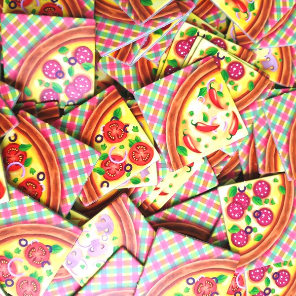По размеру и плотности они аналогичны тем, что в Каркассоне. Только изображены на них четвертинки пицц. С колбаской, помидорчиками, грибочками, сыром и перчиком... Мнямммм!