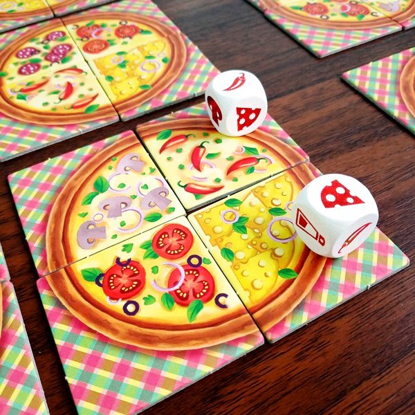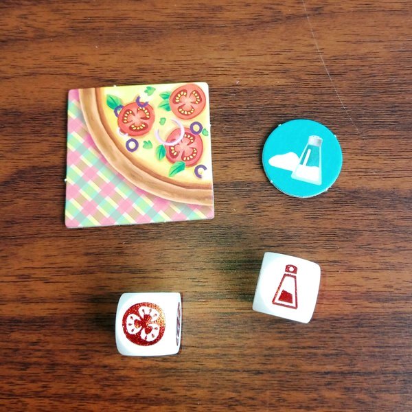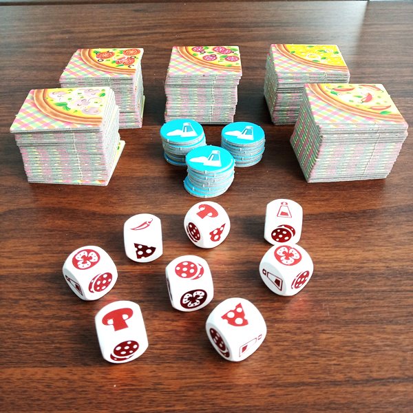 Игроки бросают кубики и по очереди разбирают их по два в руки. Это определяет, какие продукты в текущем раунде можно будет получить из общего запаса. Из них-то каждый и будет собирать свою безупречную пиццу.