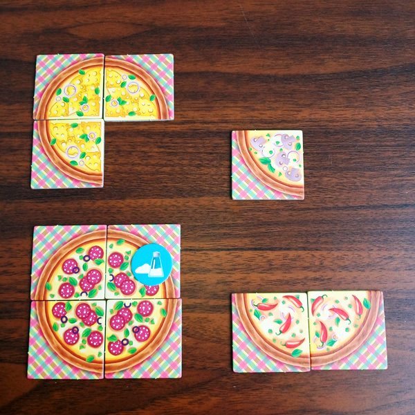 Пиццу готовить можно по-разному. Если вы предпочитаете один вид продуктов в одном блюде, то игра идёт до тех пор, пока не будут разобраны все тайлы. Затем соперники смотрят, у кого сколько получилось целых пицц с одинаковым ингредиентом (например, две грибных, три сырных) и начисляют за такие пиццы по два очка за каждую. За все остальные положено по одному. Незаконченные пиццы не считаются вовсе.