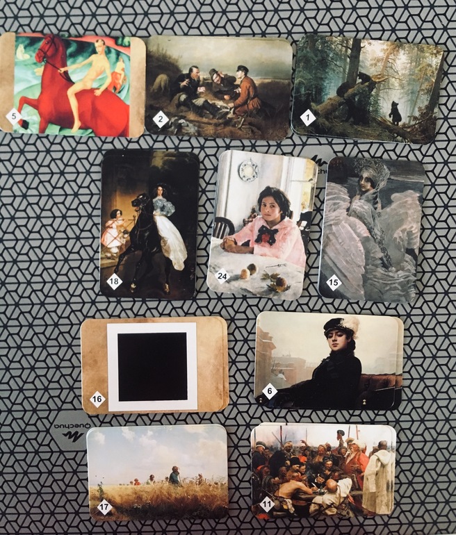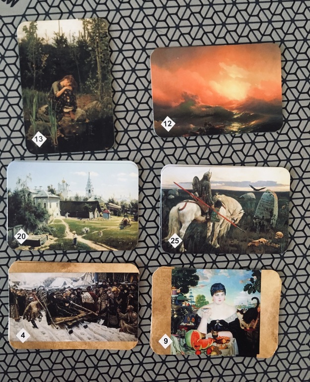 Эта игра несет в себе неповторимую атмосферу. Дети каждый раз в предвкушении. Играем мы так. Первый игрок открывает две карточки и рассказывают об этих двух картинах то, что помнит: автор, название, историю создания. Если что-то затерялось в памяти- я подсказываю и дополняю ещё какими-нибудь интересными подробностями, если знаю, конечно. Затем следующий игрок делает тоже самое и так по очереди. Если карточка открывается повторно, то произносим только художника и название картины. И я не заставляю детей , они сами делают это с огромным удовольствием и интересом. Сегодня, например, более подробно остановились на картине Боярыня Морозова, я рассказала детям, кто такая боярыня, почему она в кандалах и т.д. Сын очень любит слушать про картину Последний день Помпеи. Сколько раз уже рассказывала, да и он наизусть знает, но всё равно каждый раз просит ещё и ещё рассказать. А дочка любит историю создания полотна Бурлаки на Волге. А вот больше всего непонимания, возмущения и чувства несправедливости у сына вызывает Чёрный квадрат. Сын искренне каждый раз недоумевает и сколько же вопросов у него на языке вертится по поводу этого художника.