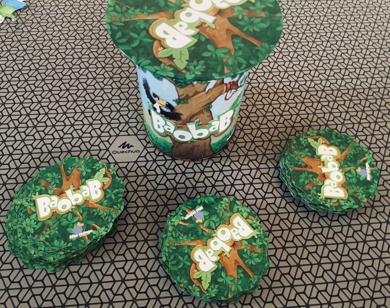 Чудеснейшая детская игра. В коробке- баобабе находится 108 карт, которые поровну раздаются в начале игры всем участникам. Наша задача избавиться раньше других от своей стопки. Все эти карты мы должны разместить на жестяном баобабе . Каждая карточка попадает на дерево определенным способом. Тукана нужно запустить , как диск, с расстояния около 30 см. Летучую мышь сбросит с высоты 30 см с закрытыми глазами. Гепарда тоже нужно бросить с высоты, но с открытыми глазами. На пчёл нельзя положить карточку с животными, а обезьяну и цветок нужно выложить так, чтобы край карточки с песком свисал с баобаба . В свой ход игрок решает сколько карточек он разместит сейчас: одну, две или три, таким образом регулируется скорость уменьшения личной стопки карт. Если в ход игрока какие-то карточки падают с баобаба, то они откладываются в штрафную стопку, туда же идут карты, которые игрок не может разместить в свой ход. Простые правила вроде, но игра выходит азартной, весёлой и совершенно не надоедает. Дети прониклись, много играют вдвоём, а иногда и наедине тренируются запускать самую сложную карту- тукана.