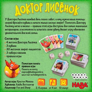 У Доктора Лисёнка каждый день полно забот, и ему нужна ваша помощь: скорей бросайте кубики и лечите милых лесных зверят! Помогать Доктору Лисёнку легко и весело - правила этой игры доступны для самых маленьких ветеринаров, а возможность испытать свою удачу делает игру одинаково увлекательной для всей семьи.