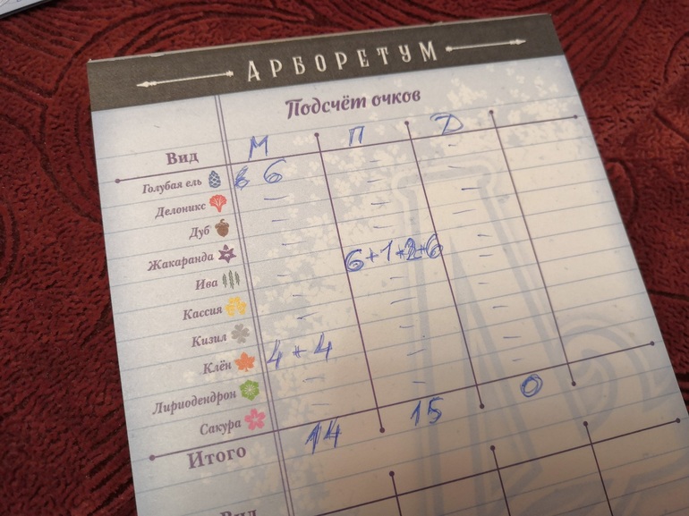 Даже не могу понять до конца причины неприятия игры мужем и сыном. Сразу отметили чувствительное время даунтауна. Тематика - высаживаем аллеи - не смутила точно. Но нет никакого азарта. Мальчики даже ради разнообразия пытались вести непредусмотренные игрой переговоры: "Давай, ты отправишь в стопку сброса дуб, который я заберу на своем ходу, а я тебе в обмен сброшу сакуру".