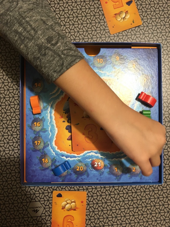 Нравится всё больше и больше. Вот вроде простая ходилка, но вот эта возможность по ходу решать , бросать ли второй, а потом третий кубик, вносит весомую изюминку. А условие, что главной в принятии решения о броске становится та черепаха, которая сидит сверху, и она же забирает победную карточку с кладкой яиц, задаёт игре хитренький темп.
