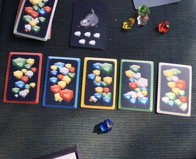 Историю появления этой игры я напишу в отдельном посте. Одно могу сказать точно, описание этой карточной игры привлекло моё внимание ещё на этапе анонсов. Сразу решила, что игру куплю. Хорошая игра. Рекомендована с 6 лет, но с детьми такого возраста поиграть не довелось. Испробовала на моих детях, сыну в 8 лет на скорость сложно ориентироваться в поиске, он не успевает. Мы с дочкой приблизительно на одном уровне. Также я испытала игру в компании трёх мальчишек( включая моего сына) 7-8 лет. Вот в такой компании я явно поняла, что у игры есть потенциал. Ребятам очень понравилась! Они все считали кристаллы, пытаясь делать это полушепотом, водили в воздухе пальцами, с криками хватали нужный камень. Эмоции били через край. Все , как один, сказали, что игра очень понравилась! Кратко смысл игры на примере этой фотографии