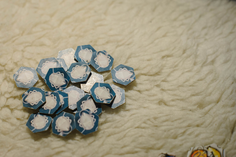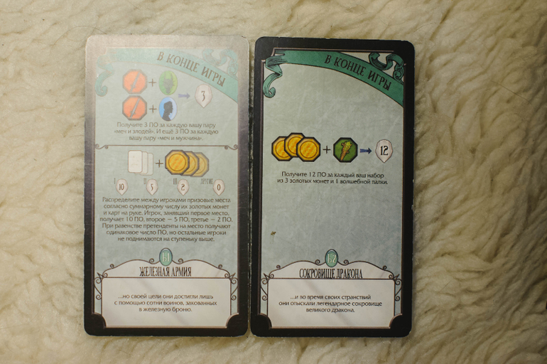 А победные баллы в виде драгоценных камушков, смотрятся очень красиво. Кроме того, они в другой стороны все одинаковые, всю игру берешь себе баллы и не знаешь, что там у других, все закрыто. В итоге кто победит совершенно не понятно, пока не посчитаем баллы в конце. Мне очень нравится этот момент, потому что когда кто-то явно выигрывает иногда теряется азарт, а тут нет.