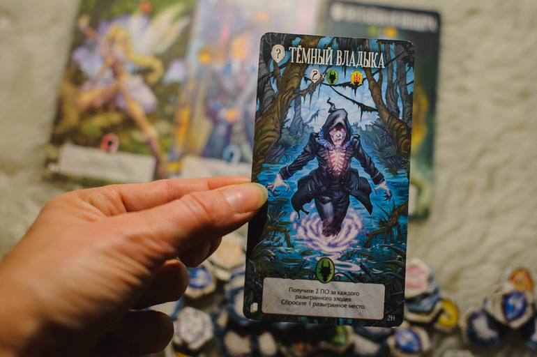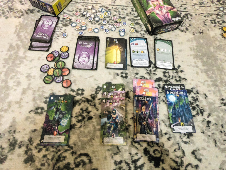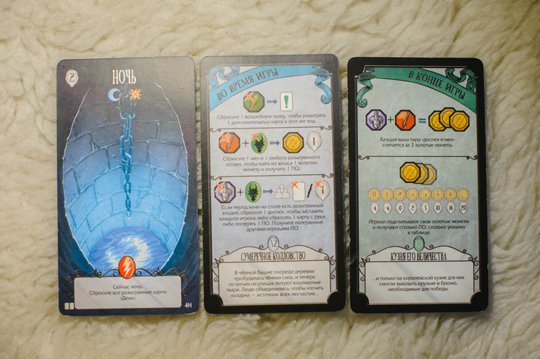 Начинается партия всегда ночью. И вытягивается по карте начала сказки и окончания, которые будут определять правила во время игры и то, что может принести очки в конце. В коробке по три карты А и Б, поэтому условия каждую игру меняются.