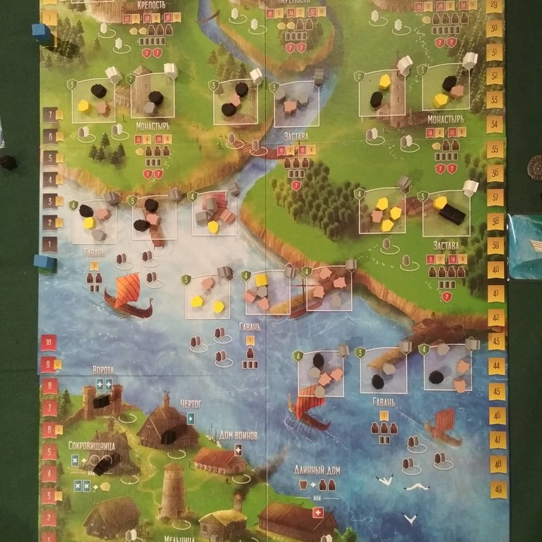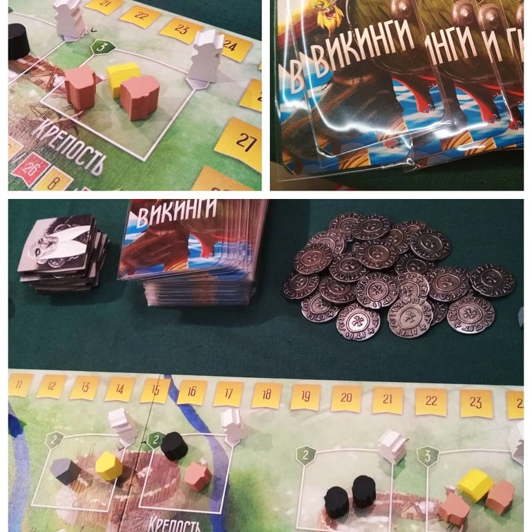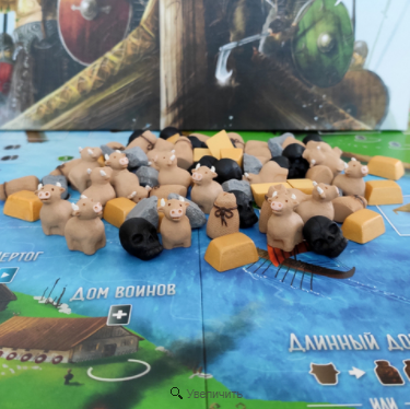 Не сразу разобрались с тонкостями, хотя правила просты и понятны. Много компонентов. Золото, железо, валькирии, провизия, скот, монеты, работники черные, работники серые и работники белые. И ещё карточки жителей и карточки подношений конунгу. Глаза слегка разбежались)))