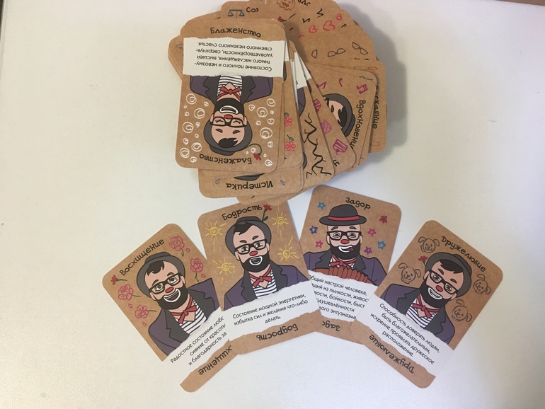 На каждой карточке помимо изображения эмоции даётся краткое описание этой эмоции. Кстати на картах изображён автор этой игры- Кирилл Степин)))