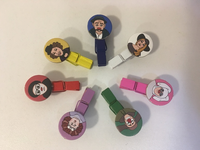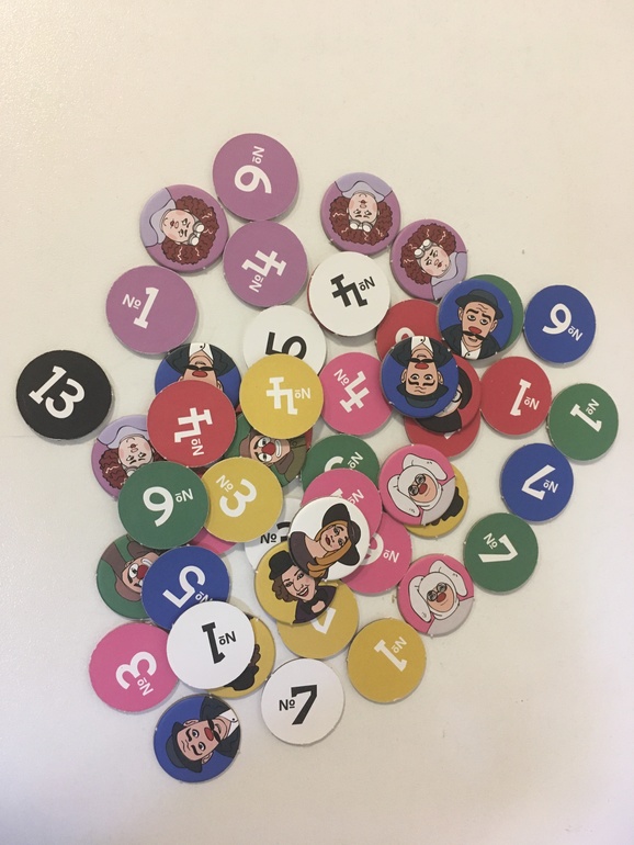 Вместо фишек в игре используются прищепки с изображением семи персонажей на разном цветовом фоне.