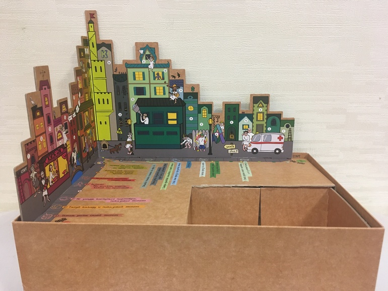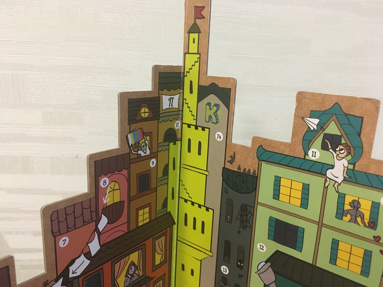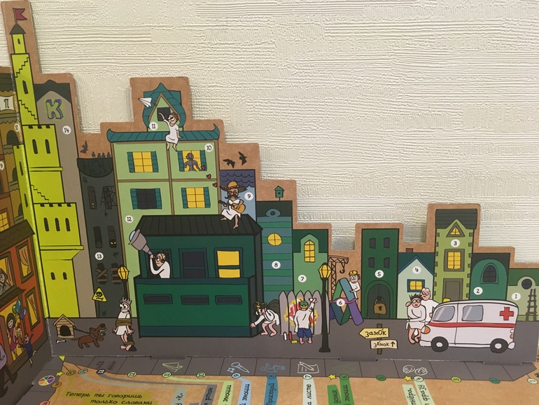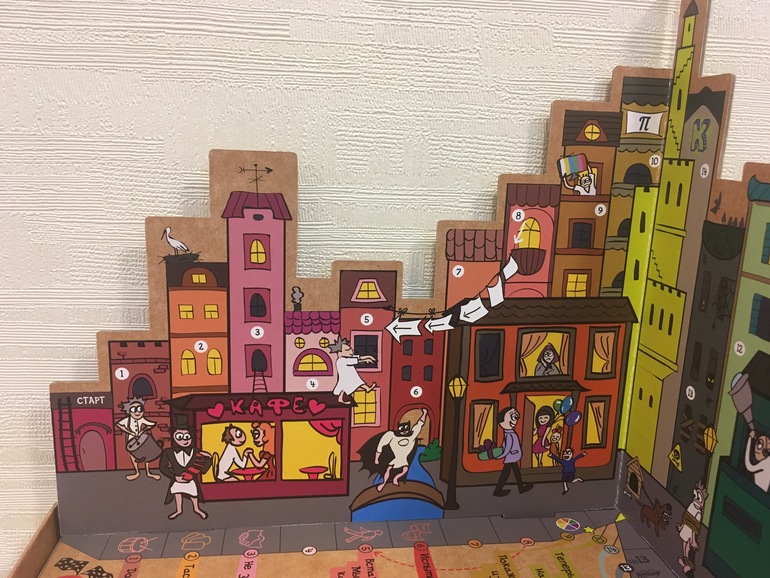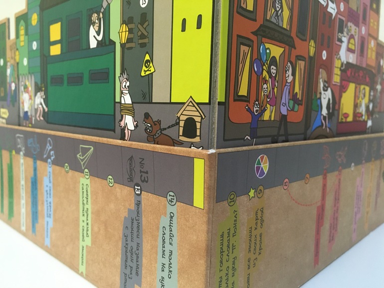 В ложемент коробки вертикально устанавливается поле для игры, которые представляет собой улицу, где каждый шаг-это дом со своим номером.