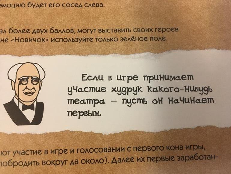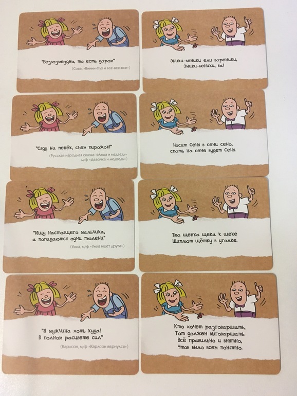 В начале игры каждому игроку раздаётся по 8 карт эмоций. Также имеется колода из 50 карт, на которых написаны различные цитаты из книг и поговорки, с двух сторон карточки. Она лежит рядом с полем. Примеры карточек.