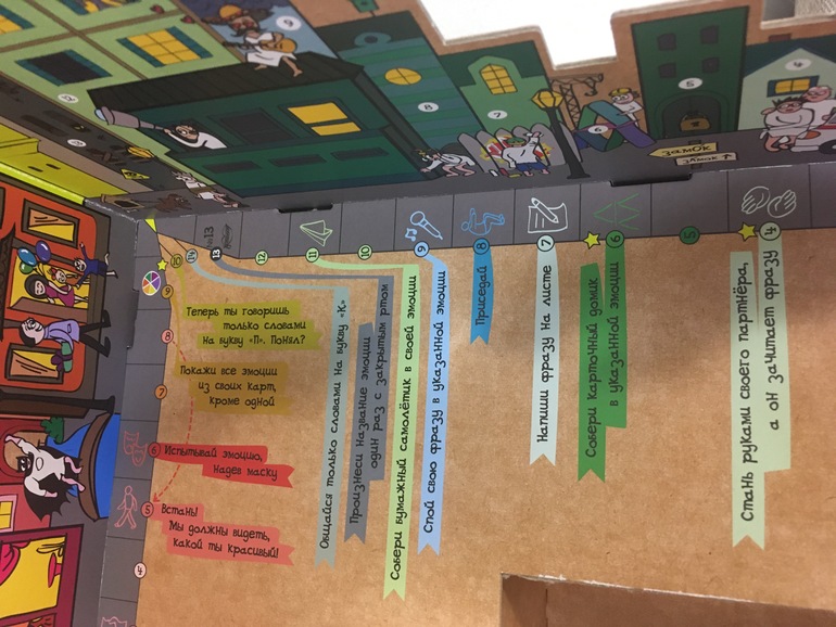 1.Почти возле каждого дома указаны дополнительные условия, которые нужно соблюсти при показе эмоции, если ваша прищепка стоит на этом доме, например, ходить на месте, делать приседания, стучать по столу во время показа эмоции.