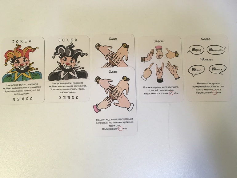 2.Среди карт эмоций есть 5 особых карт. Три из них предлагают сыграть мини-игру, например, одна из них - «хлоп» (как только эта карта появляется на столе, игрокам нужно как можно быстрее накрыть её ладонью. Игрок, чья рука оказалась последней, должен сдвинуть свою прищепку на один шаг назад) и две карты джокеров, имея такую карту, вы можете продемонстрировать любую эмоцию которая приходит вам на ум.