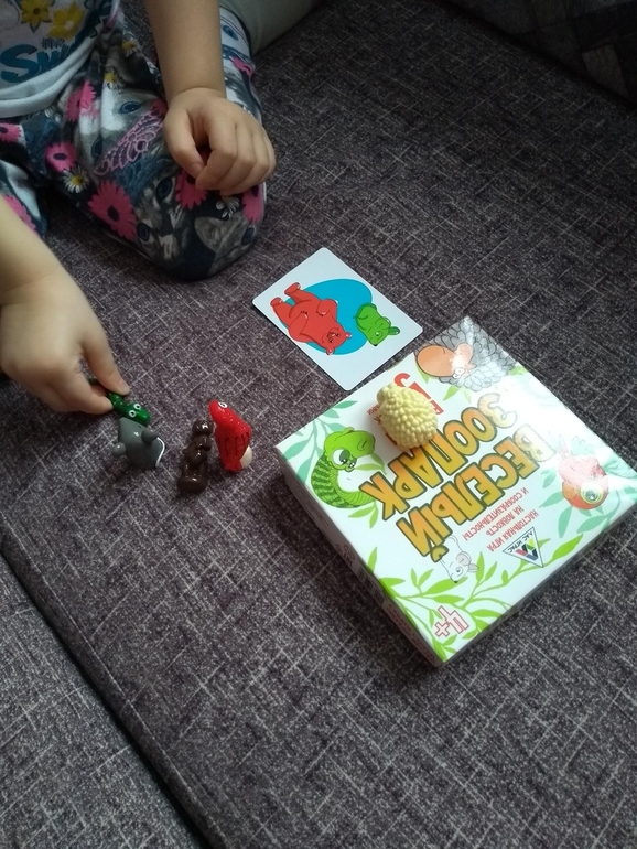- Веселый зоопарк от Лас-Играс, аналог Барабашки. Начали с 2 лет. Начала с простыми карточками, я просила найти того, кто правильного цвета. С неделю как пробуем со сложными карточками, спрашиваю кто тут зашифрован, сначала рассуждали и убирали фигурки вместе, сейчас уже пытается сама рассуждать.