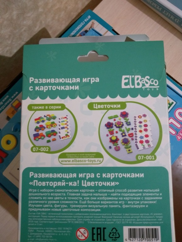 - Цветочки El-Basco. Играем с 1.10. Сначала просто выдавливали детальки и вставляли в подложки. Сейчас собираем по 1-2 цветочка в зависимости от настроения. Иногда попросит сама.