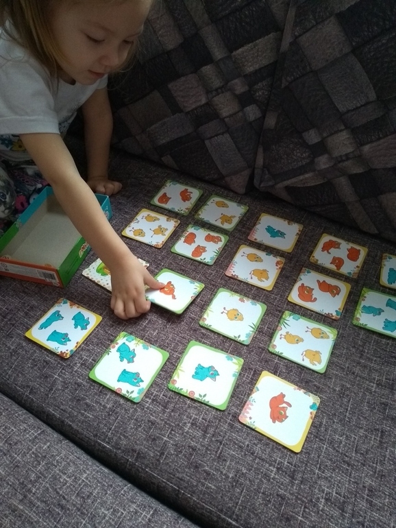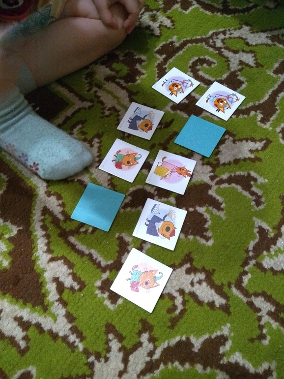 - Три кота мемо. Играем с 2.6. Любимый мультик дочери, поэтому игра достается частенько. Берем три пары карточек и ищем одинаковых. Сейчас дошли до 5 пар, но видимо я поторопилась с увеличением количества, потому что может отказаться искать прямо посередине игры, вернемся к 4 парам.