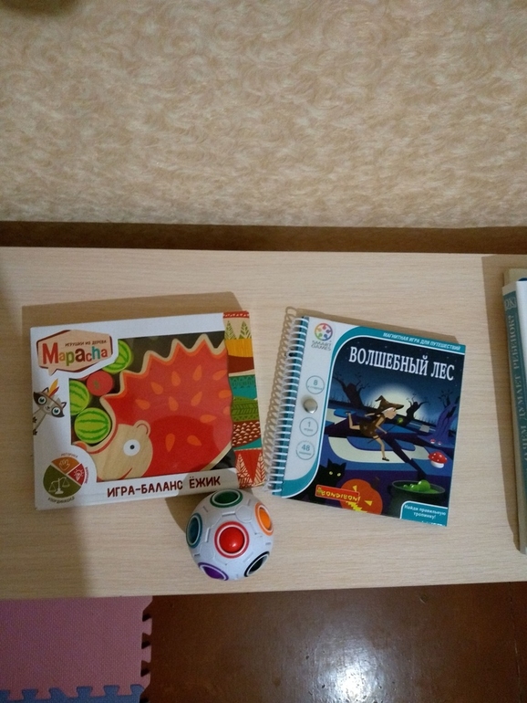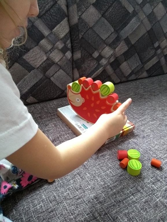 - Балансир-ежик Mapacha. Начали с 2 лет. Поначалу совсем не зашел, не получалось ставить бочонки, дочь возмущалась и отказывалась вообще играть, что с ней случается редко. В 2.5 случилась любовь, играем по правилам с кубиком, нервничает, когда остается два цилиндра и говорит «Я боюсь ставить»)