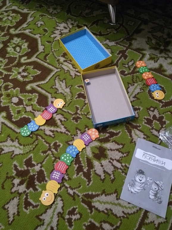 - Разноцветные гусенички. Играем с 2.6. Любимая игра. Играем не по правилам, берем каждый по голове гусенички, кидаем кубик и пристраиваем детальку выпавшего цвета. У кого гусеница длиннее, тот и выиграл. Под конец, когда деталек остается 3-4 шт, дочь начинает мухлевать - выбирает нужный цвет и аккуратненько кладет кубик нужным цветом вверх)) третья гусеница на фото - бабушкина, она тоже любит эту игру)