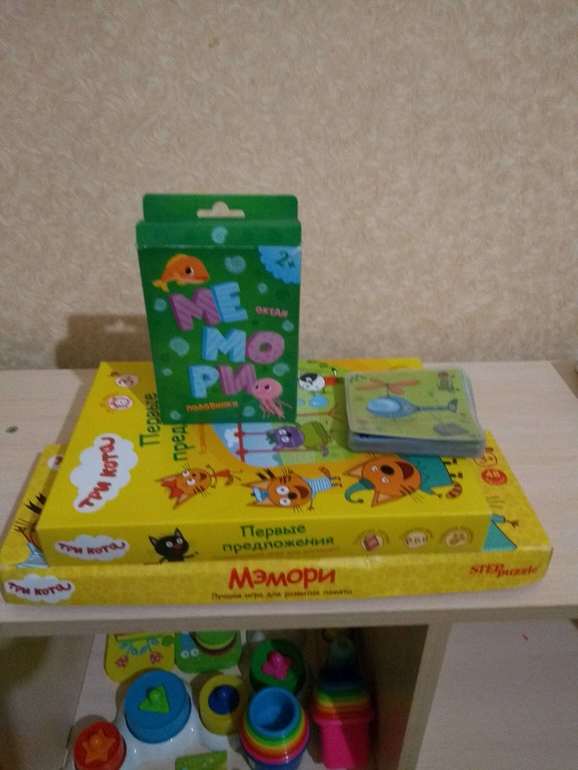 - Три кота предложения. Начали с 2.5. Хорошая игра на развитие речи. Совпадение или нет, но после нее дочь заговорила предложениями. Играем в нее так - берем одну большую карточку и проговариваем, кто что на ней делает. Потом я карточку убираю, выкладываю подходящие маленькие карточки плюс 3-4 шт лишних и прошу подобрать подходящие карточки, при этом дочь проговаривает, кто что делает.