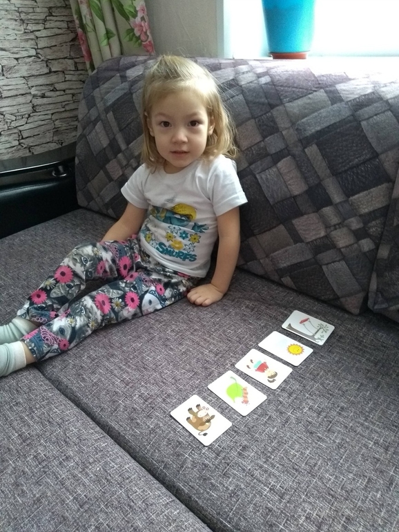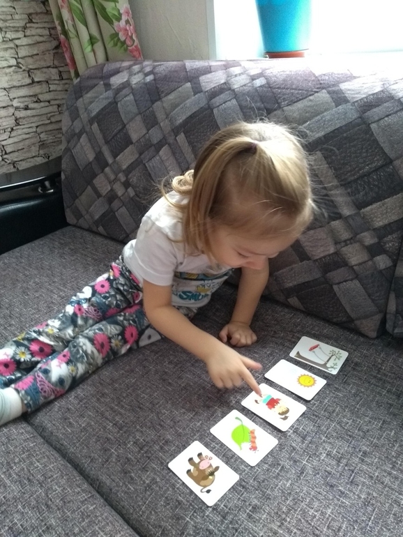 - Живые картинки. Фаворит. Начали играть с 2.5. Сначала я выкладывала три картинки в ряд, потом дочь закрывала глаза, я переворачивала одну карточку и дочь искала отличия. То ли слишком легко, то ли поздно начали, но ошибок не было ни разу, даже со сложными на мой взгляд карточками с тарелкой, вилкой и ложкой. Сейчас выкладываем по 5 карточек.