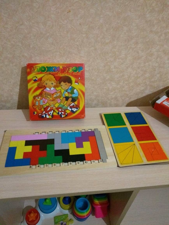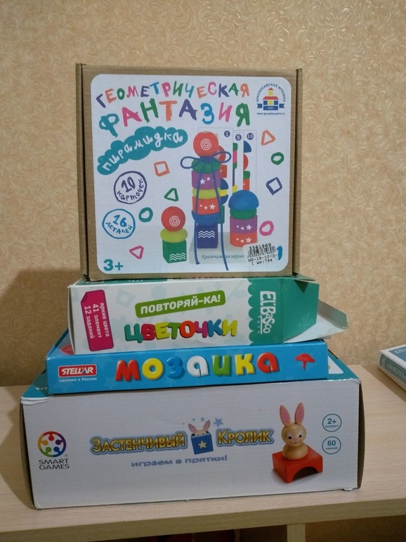 - Геометрическая фантазия. Играем с 2 лет. Поначалу никак не шла, дочь упорно не понимала, зачем ей собирать по какой-то там картинке, а не так, как душа пожелает, со скрипом собирали 1 карточку и на этом все. С 2.6 наметился прогресс, собирает сама почти всегда без ошибок 3-4 карточки.