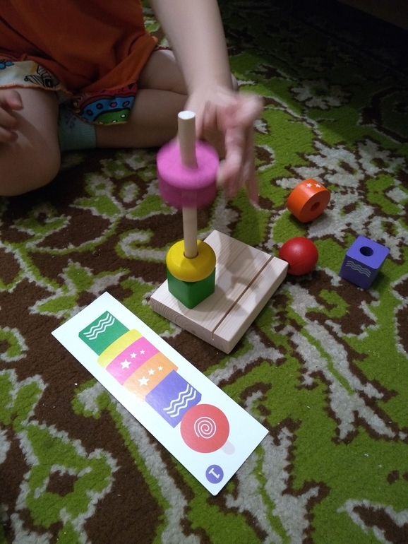 - Мозаика. Играем с 1.10. Начинали с цветных дорожек, потом собирали цветочки по образцу, сейчас прошу дочь продолжить последовательность с чередованием 2 цветов. Изредка просит сама, чтоб сложить цветочки.