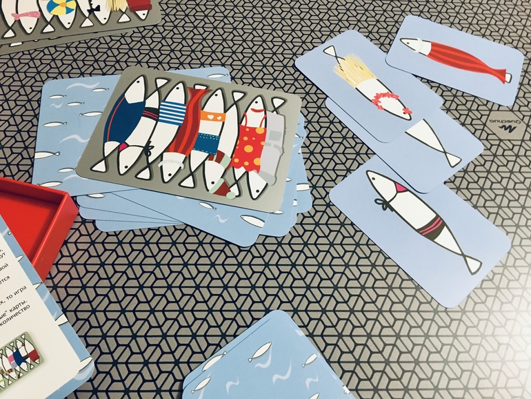 На удивление, выбрала дочка. Сыграли одну партию, мои ощущения пока не изменились. Дочка не ошиблась ни разу, но она и не рискует выкладывать, если не уверена в том, что правильно запомнила. Сын ошибается часто, поэтому заведомо ясно, что проиграет. Самой большой неожиданностью стало для меня заявление дочки, что ей сардины очень понравились и она занесёт их в список своих любимых карточных игр. Сыграли одну партию, выиграла я.