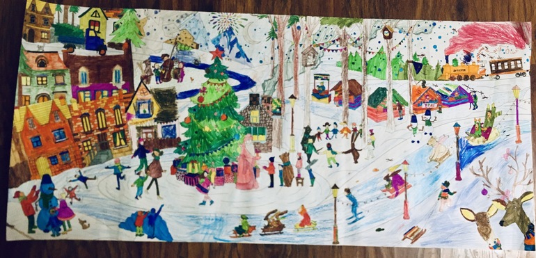 А ещё мы вчера закончили большую раскраску, которую начали ещё в декабре 2016 года. И все эти годы мы доставали её в декабре, дети по чуть-чуть красили, после каникул прятали. И так уже 4 год подряд. Так что эта картинка стала для нас особенной, дети взрослели вместе с ней. Там присутствуют штрихи и раскрашенные детали моего сына в возрасте 5 лет, ничего не исправляли со временем. В следующем году начнём ещё одну.